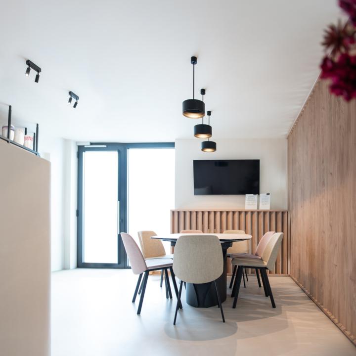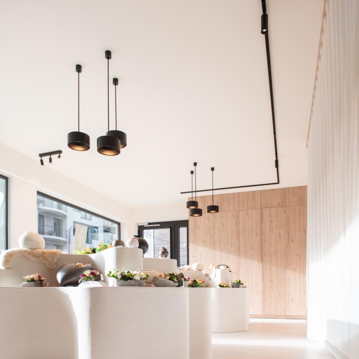 binnenkomen in de ontvangstruimte trekken onze Spazio-hanglampen meteen de